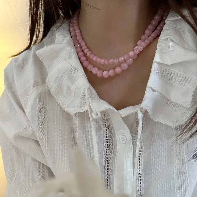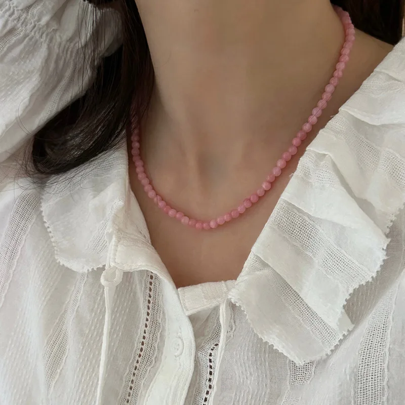 Exquisite 4 6 8mm Pink Color Round Natural Stone Beaded Necklace for Women Handmade Silver Plated Chain Strand Chokers