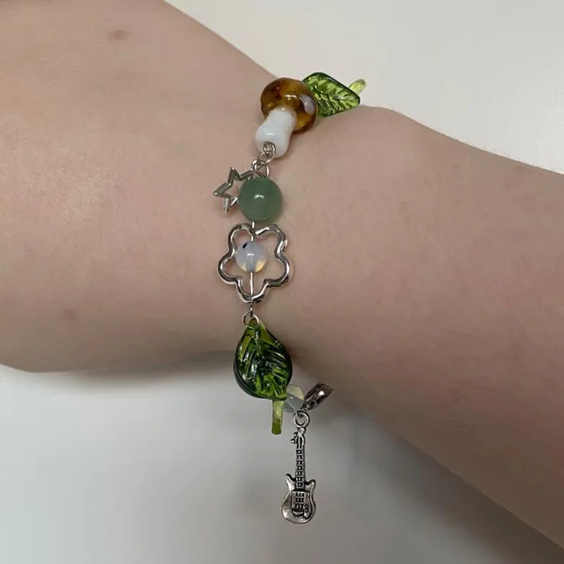 An adorable Mushroom and nature themed bracelet with Leafs, Butterfly and Flower charm and silver guitar charms